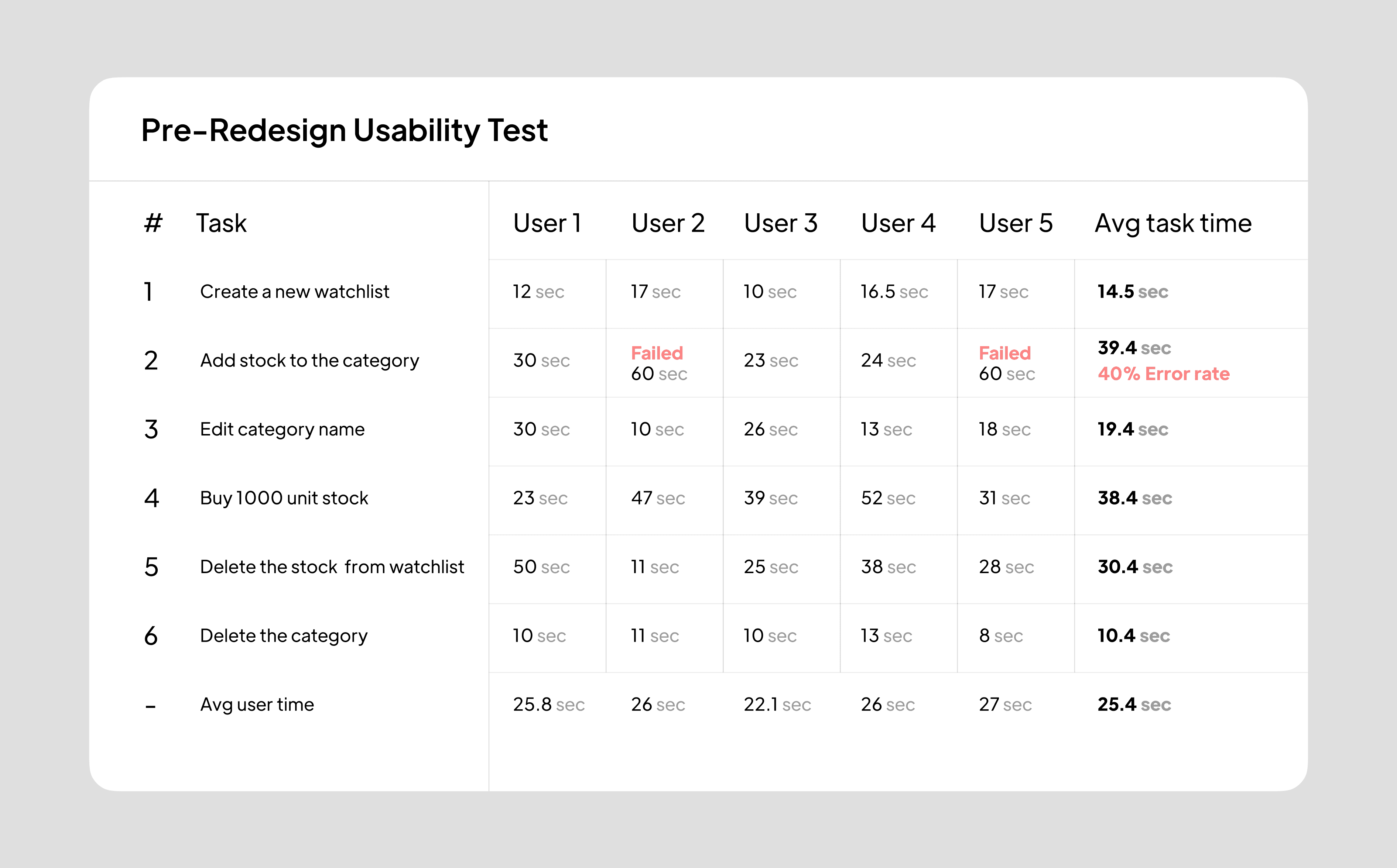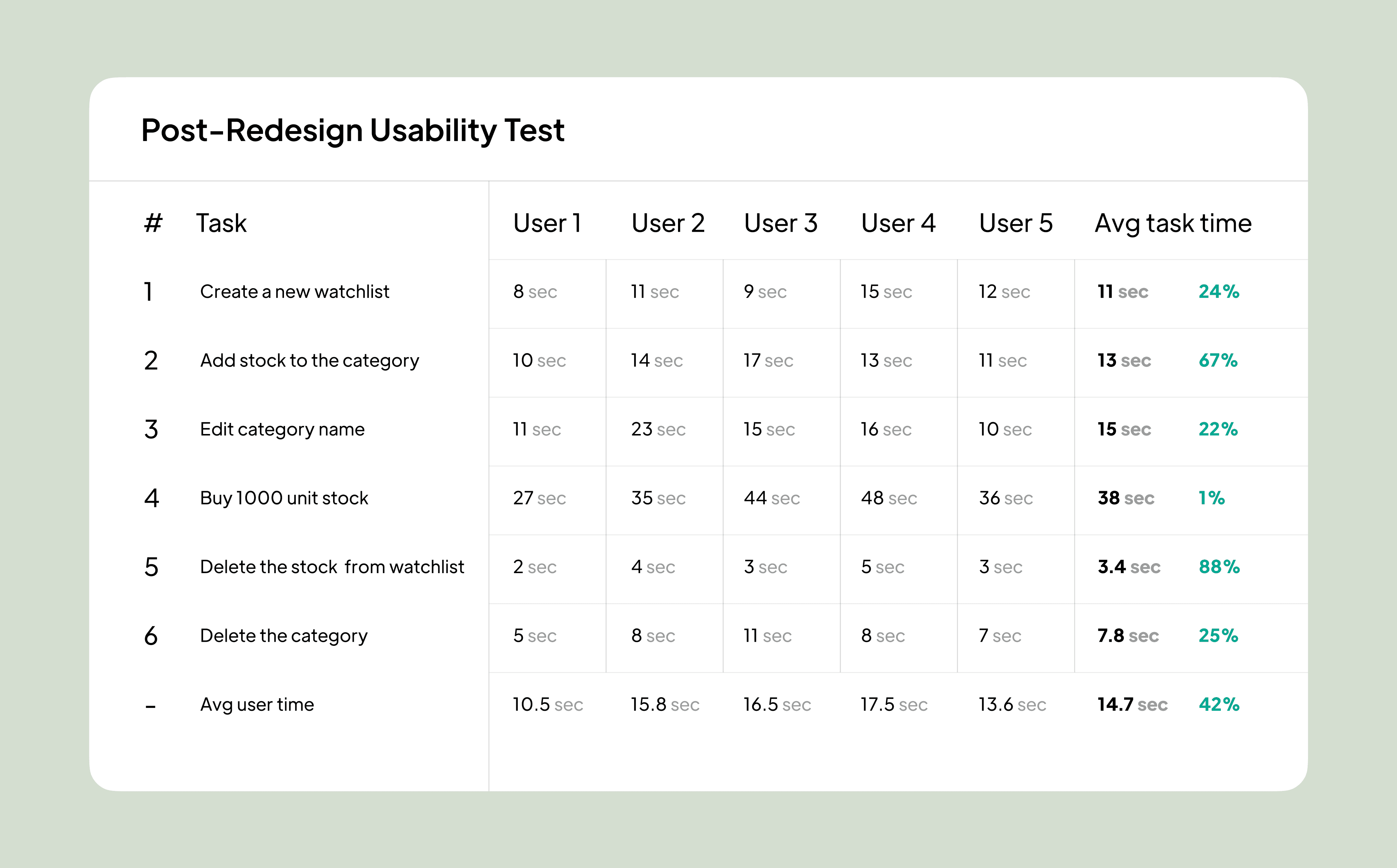 I led the optimization of the watchlist feature for a financial trading dashboard, reducing task completion time by 42% and eliminating user errors through iterative usability testing and workflow refinement.